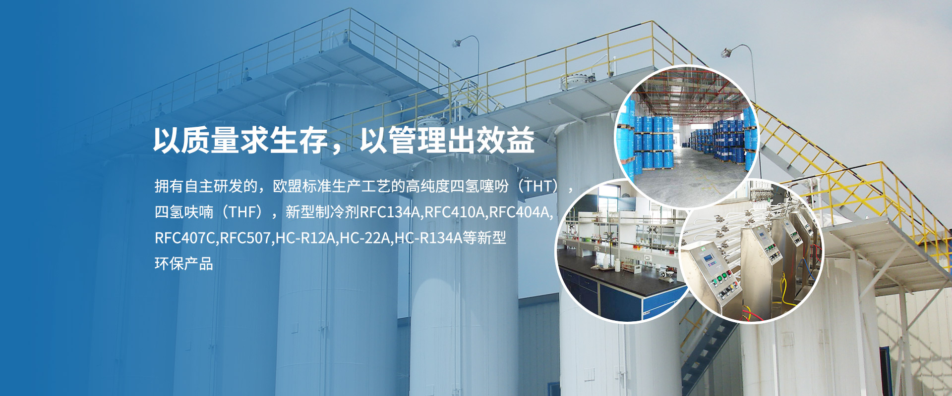 擁有自主研發的,歐盟標準生產工藝的高純度四氫噻吩(THT),四氫呋喃(THF),新型制冷劑RFC134A,RFC410A,RFC404a,RFC407c,RFC507,HC-R12A,HC-22A,HC-R134A等新型環保產品。